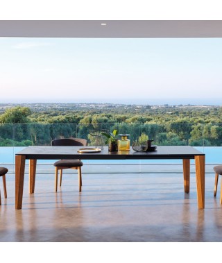 Le coordinate dello spazio cambiano all’allungarsi del piano di CARTESIO, che si prolunga quasi all’infinito. La misura è uno dei tanti punti variabili che, insieme, definiscono la forma di questo tavolo, sempre sostenuta dalle forti gambe lignee che offrono la sensazione di una sezione poligonale in torsione: il tramite verso un mondo diverso su cui appoggiare gli oggetti del quotidiano. Un tavolo di design che vive con la medesima disinvoltura in ambienti kitchen o living, anche dal gusto più tradizionale.
