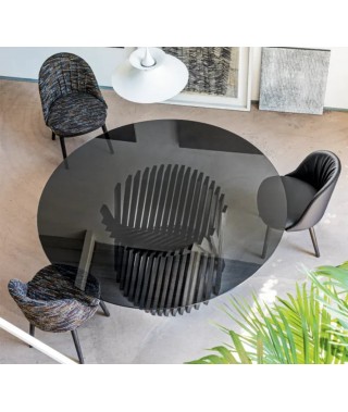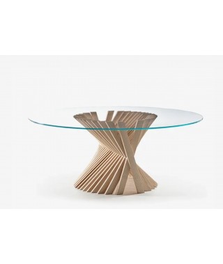Natisa continua il suo percorso di ricerca e sintesi fra manualità artigianale e design contemporaneo, dando vita un nuovo tavolo di design della famiglia Wave. La base di questo tavolo è formata da listelli di legno incrociati intorno a un invisibile travato centrale, le cui linee sono disposte simmetricamente in modo da creare un’unica forma avvolgente, come un nido o il calice di un fiore. La bellezza di questo tavolo, leggera e allo stesso tempo stabile grazie alla sezione maggiorata dei listelli, si mette in mostra attraverso il piano in vetro, di lunghezza 180 cm. Un tavolo di design perfetto per la zona living, ma anche per sale riunioni in contesti business.
