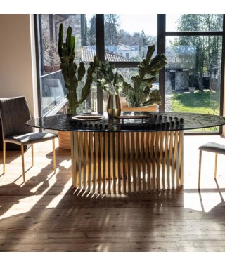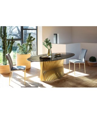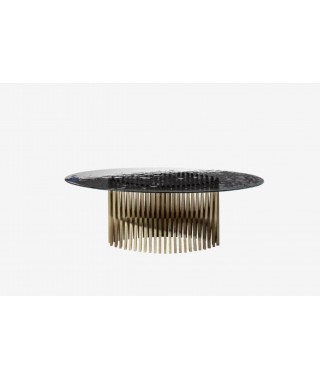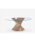Natisa continua il suo percorso di ricerca e sintesi fra manualita artigianale e design contemporaneo, realizzando un nuovo sviluppo di un’idea costruttiva assolutamente originale. La base di questo tavolo è infatti formata da listelli di legno incrociati intorno a un invisibile travato centrale, come nella collezione Wave, ma le loro linee sono disposte simmetricamente in modo da creare un’unica forma avvolgente, come un nido o il calice di un fiore.