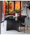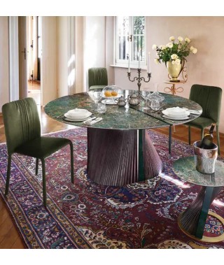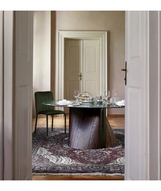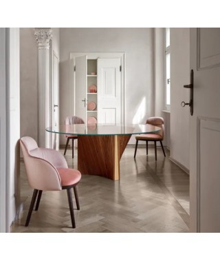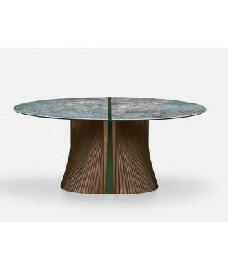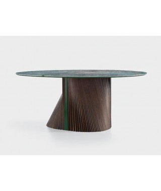 Clover, un tavolo tondo la cui base si ispira ai tre petali del trifoglio, da cui il nome. La struttura del basamento ha una tripla onda di listelli in legno su cui posa un piano tondo. A fare da trait d'union tra base e piano un elegante inserto metallico in tinta. Un tavolo di design che parla della minuziosa cura del detaglio di Natisa, perfetto per una zona living elegante e sofisticata ma anche per meeting e tavole rotonde in ambienti business.
