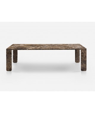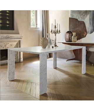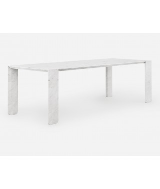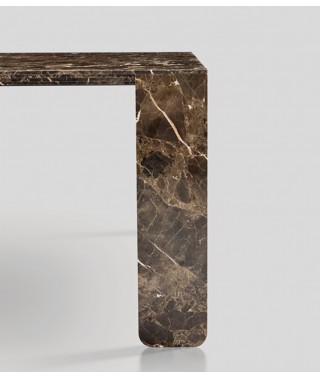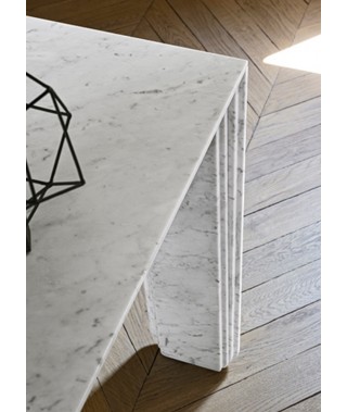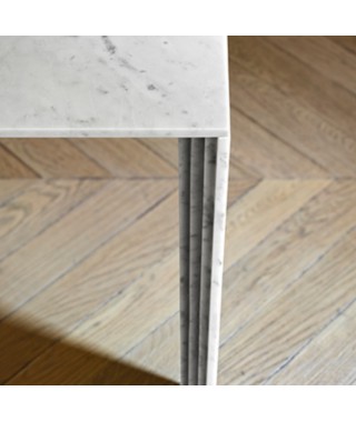 Il tavolo Corinto, elegante e scultoreo, unisce materia e geometria in un perfetto equilibrio. Il ripiano e le gambe, realizzati con lastre di marmo lavorate lungo gli spessori, presentano sottili sbalzi di 9,5 mm che conferiscono slancio e dinamismo ai volumi. Le gambe, raccordate a terra, esaltano la leggerezza della materia, mentre gli scalini verticali si innestano con quelli orizzontali del piano in un incastro perfetto. Un’anima in ferro garantisce stabilità e facilita l’assemblaggio.