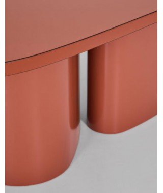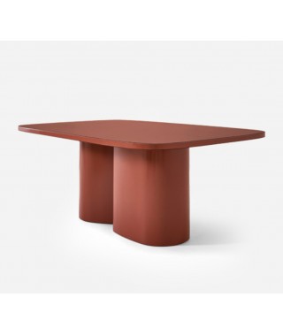 Sabi, tavolo scultoreo dalle forme pure e superfici continue, si distingue per la finitura laccata Urushi nei toni Mattone e Cipria. Il basamento curvo, di forte impatto architettonico, alleggerisce la massa e crea profondità, rendendolo ideale per ambienti di carattere.
