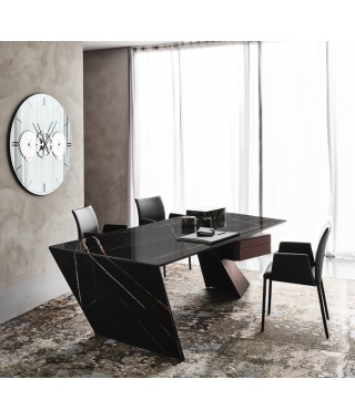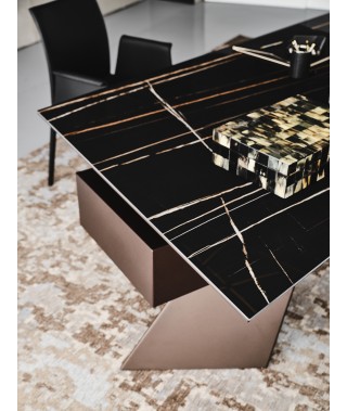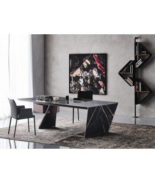 La scrivania da ufficio Nasdaq Keramik è una composizione di geometrie e materiali, dall’effetto monolite. La cassettiera in legno sfida la gravità, poggiata sulla gamba in acciaio, che incide lo spazio con una diagonale decisa. La finitura del piano in ceramica Marmi presenta una vena continua, tra la parte superiore e quella laterale, che esalta l’identità architettonica dello scrittoio.