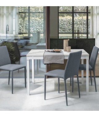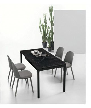 Si estende da 120 cm a 180 cm. Ha una struttura in metallo e un piano in grès porcellanato effetto marmo.