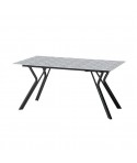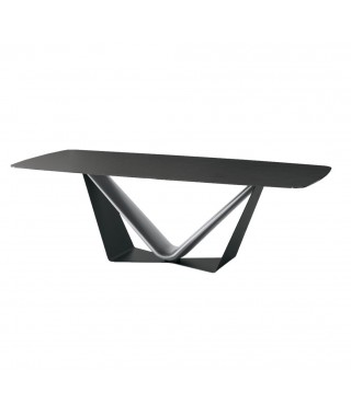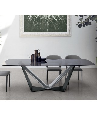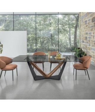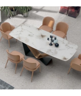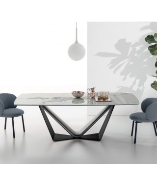 Tavolo moderno in vetro o gres porcellanato effetto marmo con una base a V che sostiene il piano in modo originale e mette in risalto le finiture metallizzate.