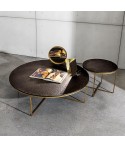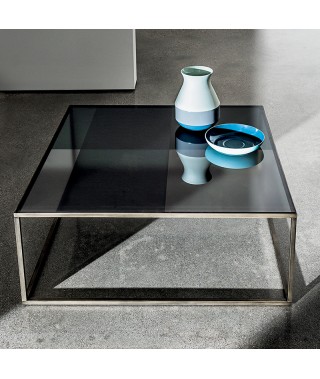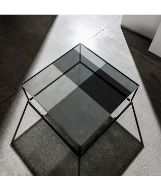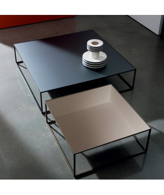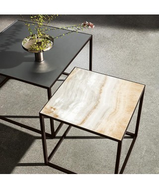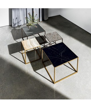Tavolino quadrato con struttura in metallo laccato nelle finiture ottone brunito o caffé.