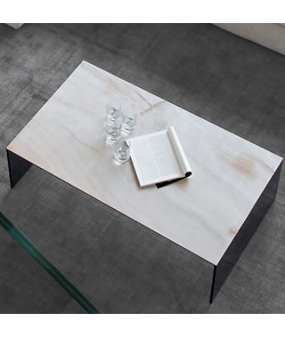Linee geometriche ed elementari per il tavolino BRIDGE, con fianchi in vetro temprato e top in accoppiato ceramica-vetro disponibile in diversi motivi decorativi.