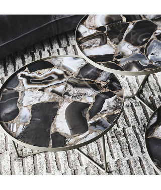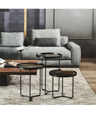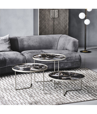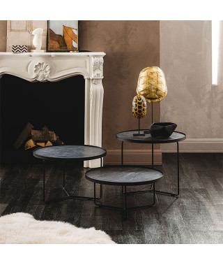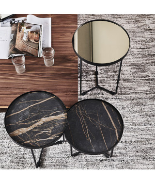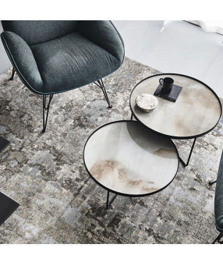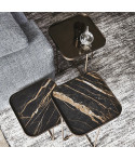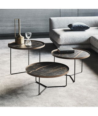 Tavolino con struttura in acciaio verniciato goffrato titanio (GFM11) o nero (GFM73), o con base in Bronze e cornice del top in Brushed Bronze. Piano in ceramica Marmi nei colori Alabastro (KM02), Ardesia (KM04), Portoro opaco (KM07), Portoro lucido (KM08), Emperador (KM10), Makalu (KM11), Breccia (KM12), Arenal (KM13) o Zefiro (KZ20).