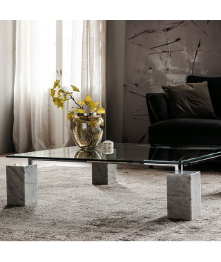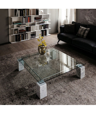 Tavolino con base in marmo bianco Carrara (BC) o nero Marquina (NM). Barre metalliche nere (OP17) o cromate (08). Piano in cristallo trasparente.
