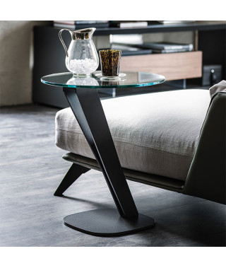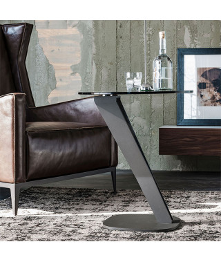 Tavolino fianco divano con base in acciaio verniciato goffrato graphite (GFM69). Piano in cristallo trasparente o fumé