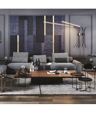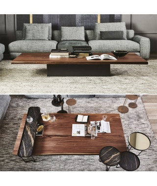 Tavolino con struttura in metallo verniciato goffrato graphite (GFM69) e piano in noce Canaletto (NC), rovere bruciato (RB) o rovere naturale (RN) con bordi irregolari in massello.